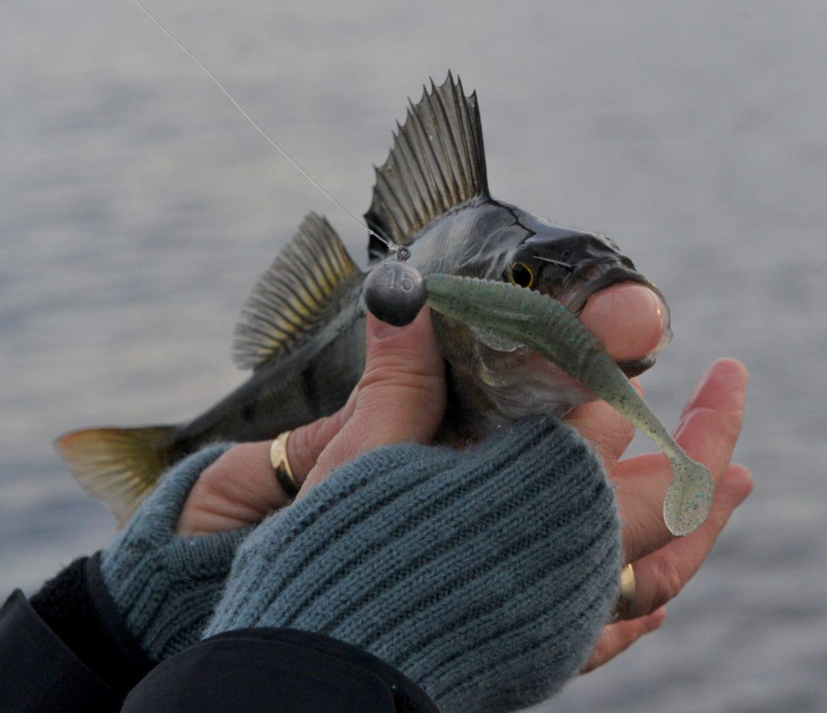 På denne tiden står abboren dypt, veldig dypt, Fra 18-30 m ca. Og da og plukke opp en Nomase Gill på 10g virket meningsløst. Men det er jo ikke noe annet å gjøre en å vente. For ned kommer den, det tar bare litt tid. Det som var gøy, når du først fikk den ned så smalt det. Det er sikkert utrolig rart og forstå men den første abborene på Realis Nomase Gill var utentvil dagens viktigste fisk. Det er så utrolig gøy å få noe men har tenkt vil fungere. Så tar det et slipp så får du svaret. Rått rett og slett. Så var det boostar wake. Jo da selvfølgelig leverte den også. Det er ikke så overraskende egentlig. Små shadder med brei kropp leverer ofte også denne gangen.