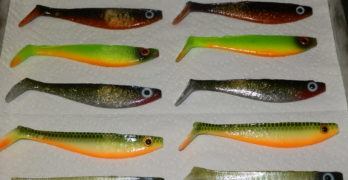 Da er jeg i mål men mine Pikewallisshadder for ørretfiske utover våren 2016 . Lengden er 11,4 cm noe jeg har lest meg frem til er en helt ok lengde for sjøørretfiske. Fargene er valgt ut helt i fra … (Les mer...) om11,4 cm shadder for mitt gummiprosjekt på sjøørret